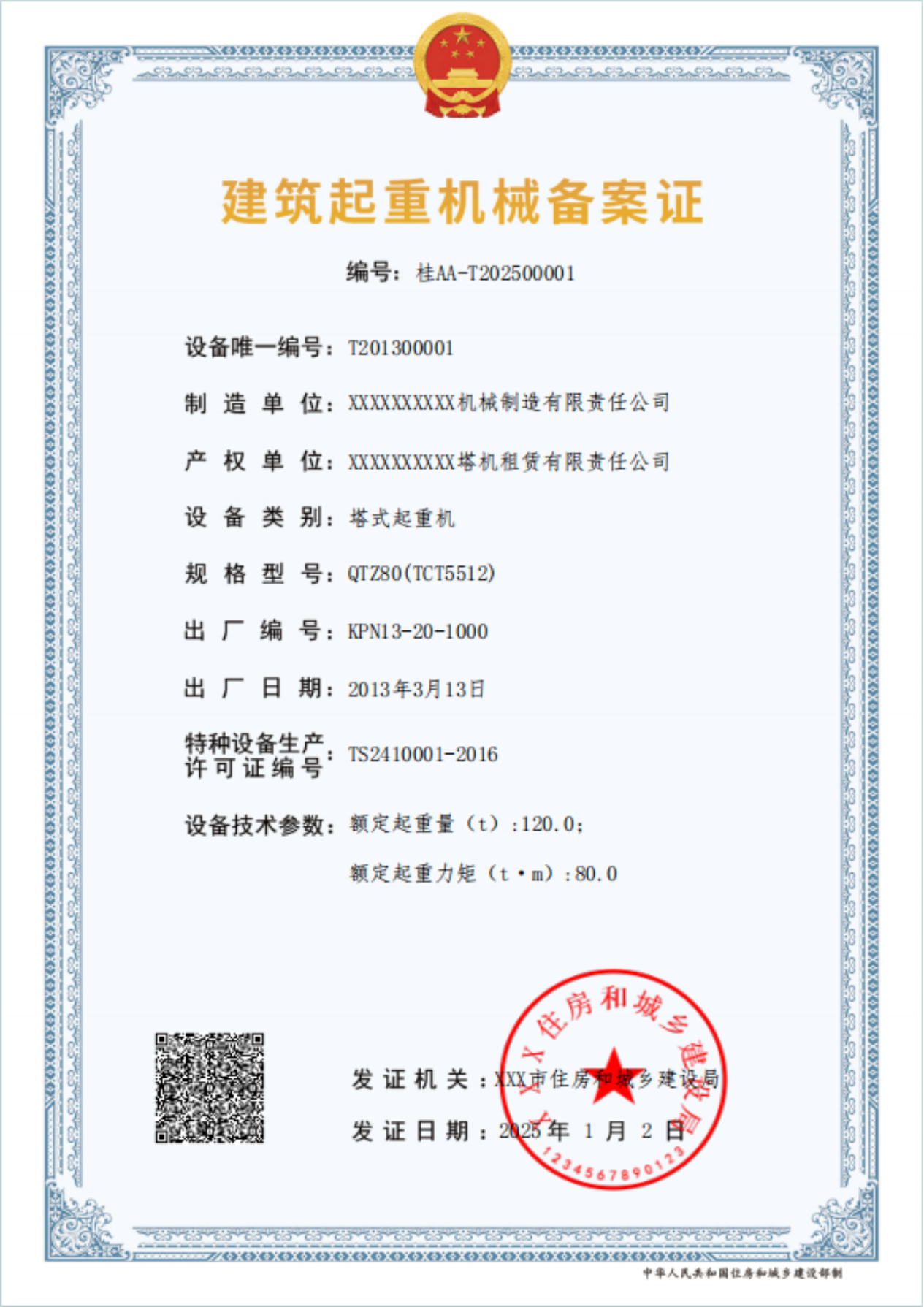 2. 建筑起重机械备案证编号由“起重机械备案属地代号+设区市的英文字母代号+区、市(县)的英文字母代号+‘-’+起重机械类别代码+颁发年份+当年流水次序号(5位)”,编号中“-”使用中文符号。因广西建筑起重机械备案统一在各设区市办理,县(市、区)的英文字母代号统一用字母“A”代替。备案证编号示例:桂AA-T202500001。