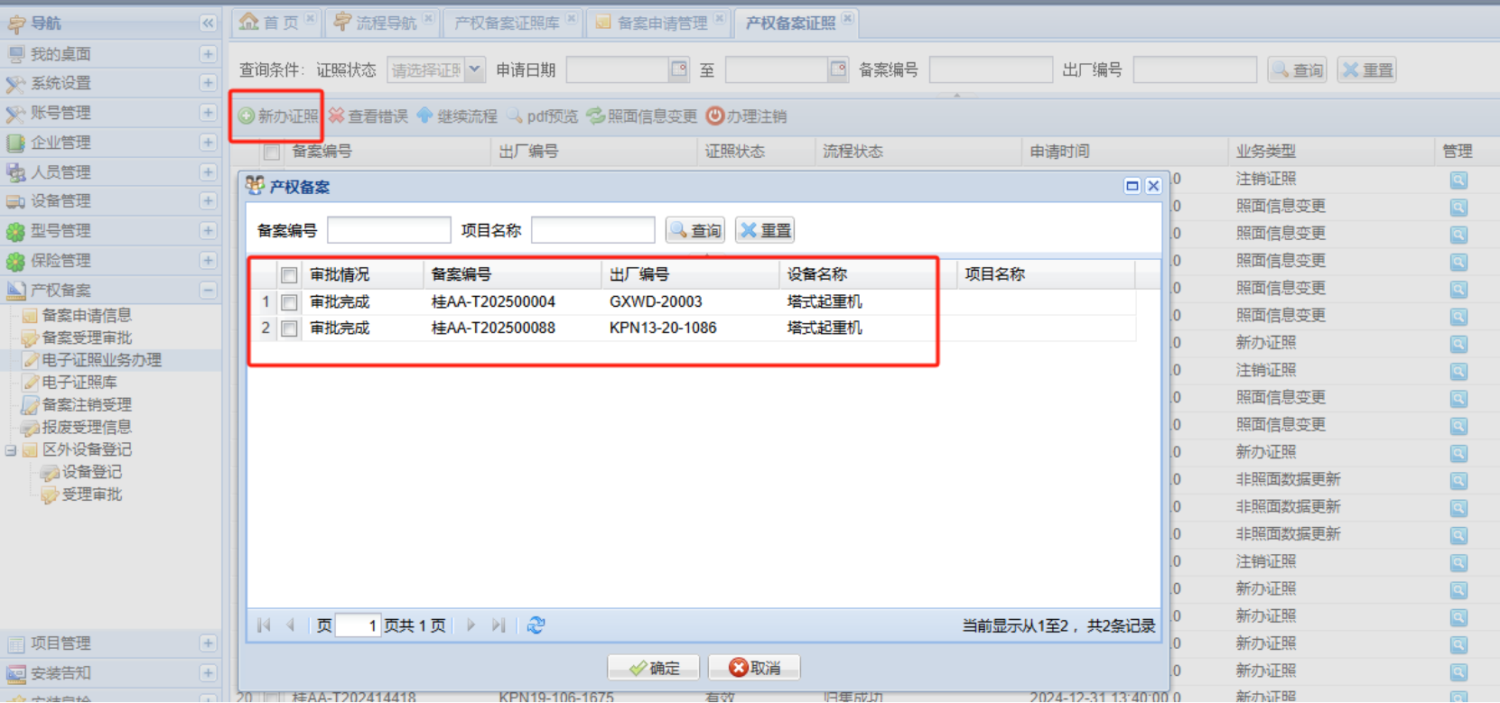 选择菜单“电子证照业务办理”,点击“新办证照”,系统自动查询出【审批通过】的备案申请,选择一条点击确定。