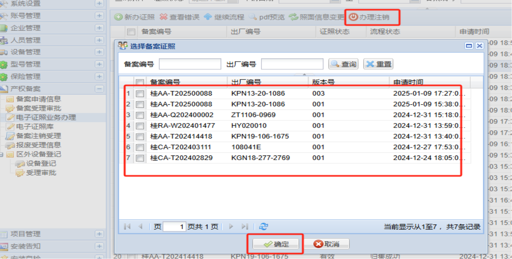 点击“办理注销”,系统自动查询出当前“有效”的所有证照,选择其中一份,点击确定。(注意:设备应先走完“备案注销”流程,才能申请办理注销)