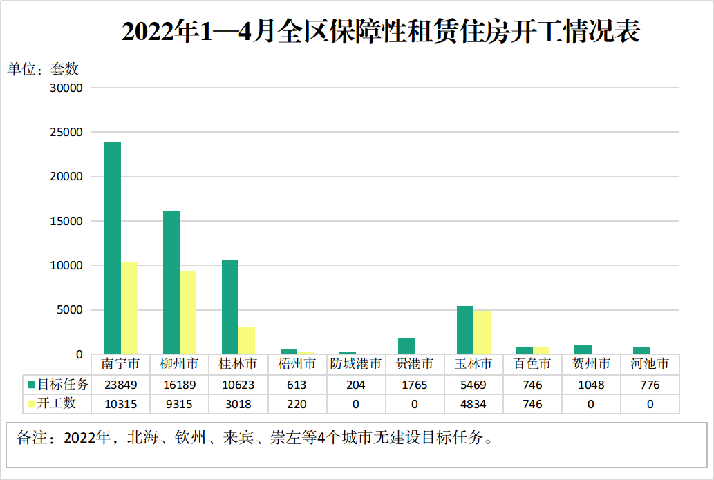 2022年,全区保障性租赁住房建设目标任务为6.13万套。截至4月25日,已开工2.84万套,完成年度目标任务的46.42%。其中,建设进度较快的设区市有:南宁市(10315套)、柳州市(9315套)、玉林市(4834套)和桂林市(3018套);尚未开工的设区市有:防城港市、贵港市、贺州市和河池市。