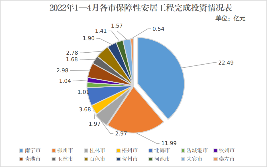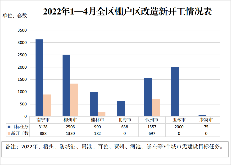 (一)全区棚户区改造新开工目标任务完成情况。2022年,全区棚户区改造新开工目标任务为10894套。截至4月25日,新开工3097套,完成年度开工任务的28.43%。其中,棚户区改造建设进度较快的设区市有:柳州市(1330套)、南宁市(888套)和钦州市(697套)。