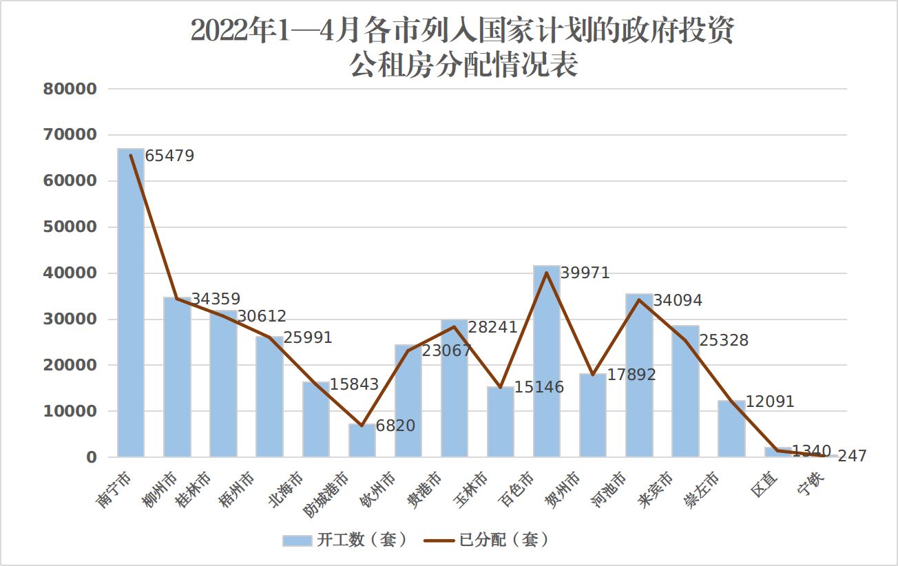 (一)全区公租房分配情况。截至4月25日,全区列入国家计划的公租房累计开工建设48.82万套(2015年以前开工建设46.93万套,2016-2021年开工建设1.89万套),已分配44.86万套。其中,列入国家计划的政府投资公租房累计开工建设40.33万套(2015年以前开工建设39.15万套,2016-2021年开工建设1.18万套),已分配37.65万套。