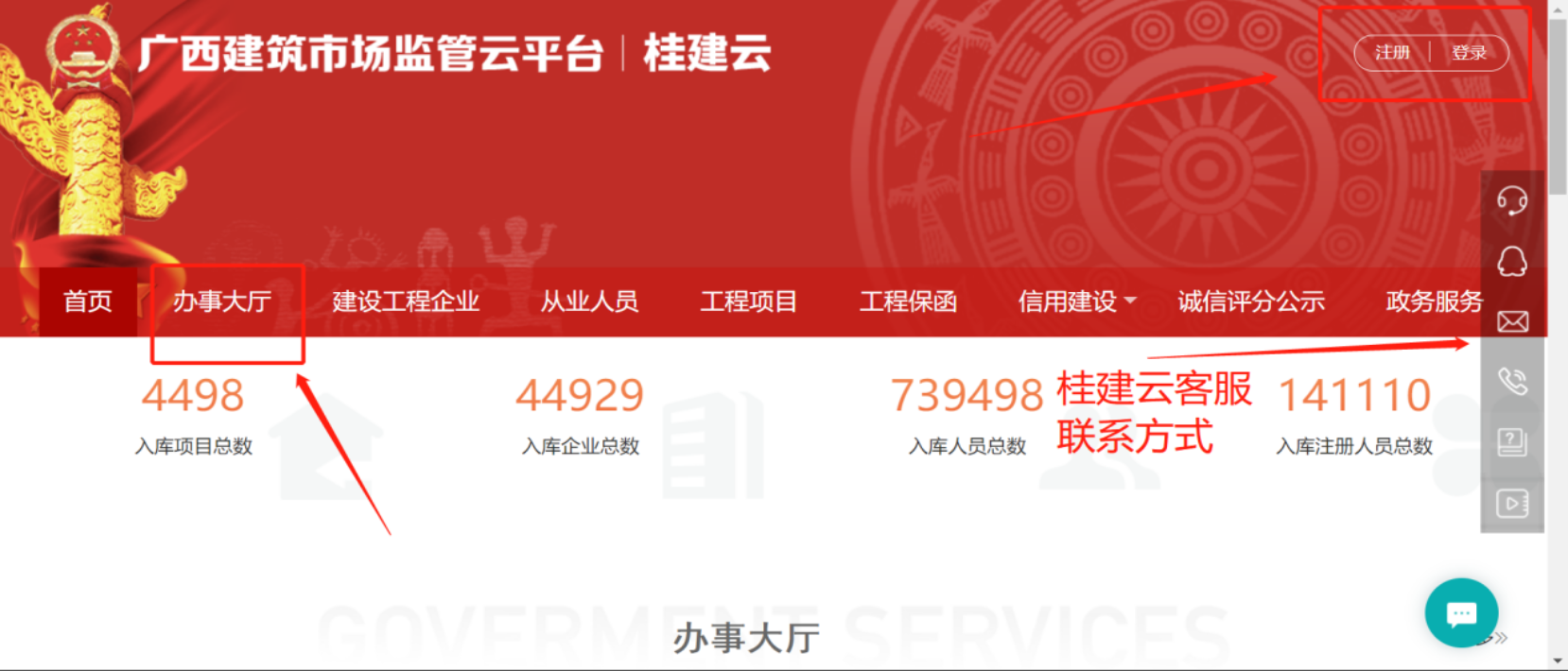 统一在“广西建筑市场监管云平台”(以下简称“桂建云”网址://gxjzsc.gxcic.net/)注册和登录,无“桂建云”账号的人员需进行注册(注册及登录问题请联系客服,联系方式在“桂建云”网站页面右侧及底部),完成“桂建云”账号注册登录后,进入“桂建云”办事大厅,点击培训考试下方“广西住建领域培训考试系统”跳转登录。(继续教育客服QQ:3826858195)