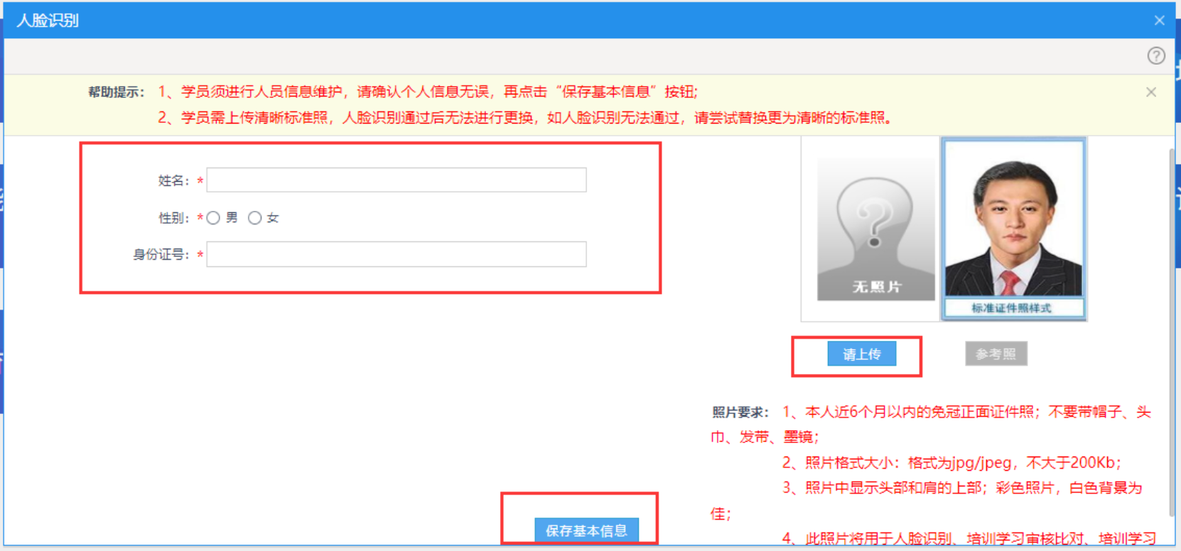 1.1.1维护人员基本信息,填写人员姓名、身份证等人员信息,上传标准照(照片格式大小:格式为jpg/jpeg,不大于200kb)。