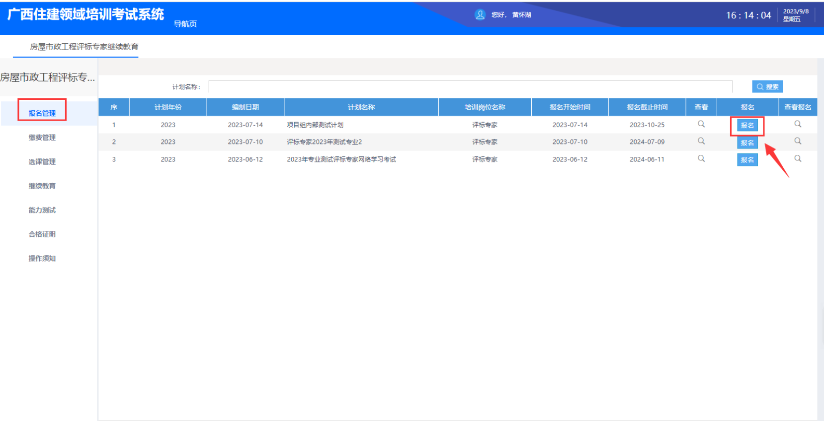 点击报名管理,选择计划,点击报名按钮