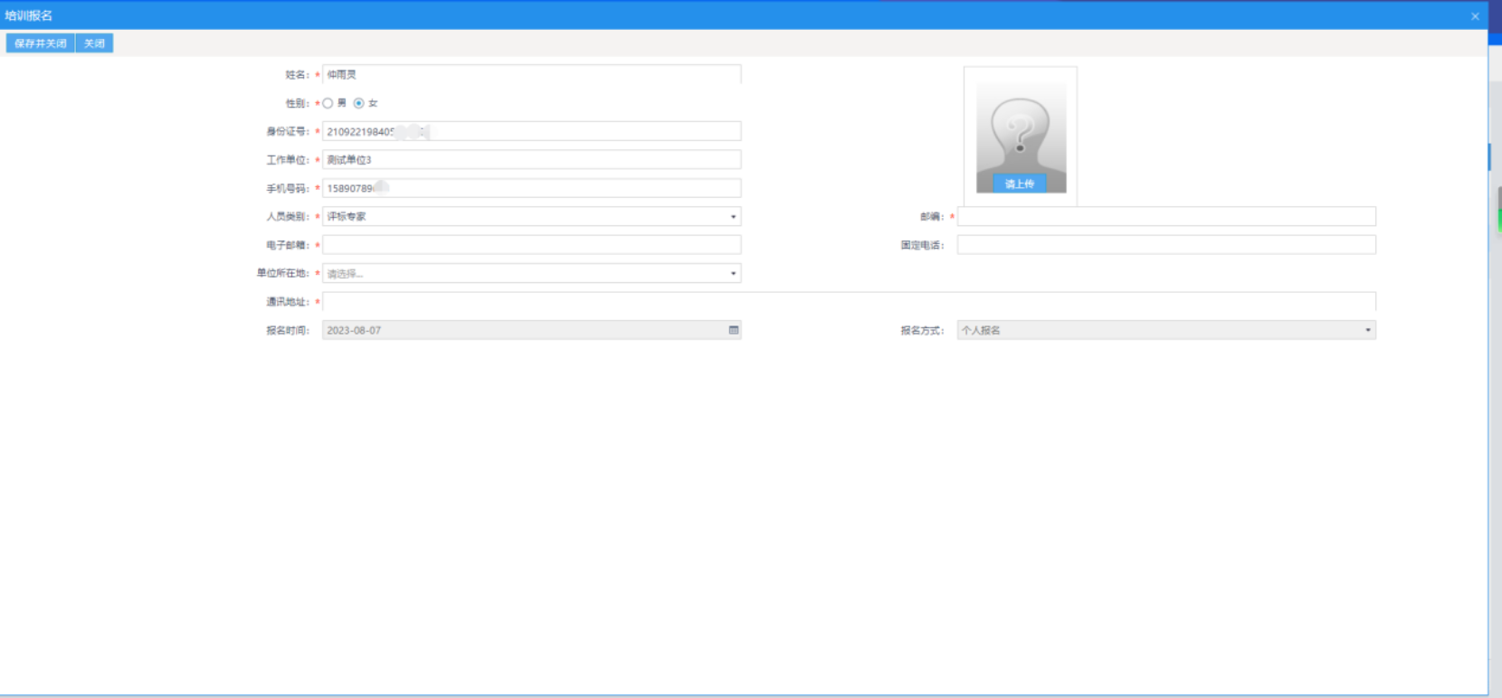 填写个人信息,上传所需附件,核对无误后保存并关闭(注意填写信息时请核对报名信息是否有误,如姓名、身份证等字段是否正确,保存并关闭即是提交报名,提交后报名信息不可修改)。