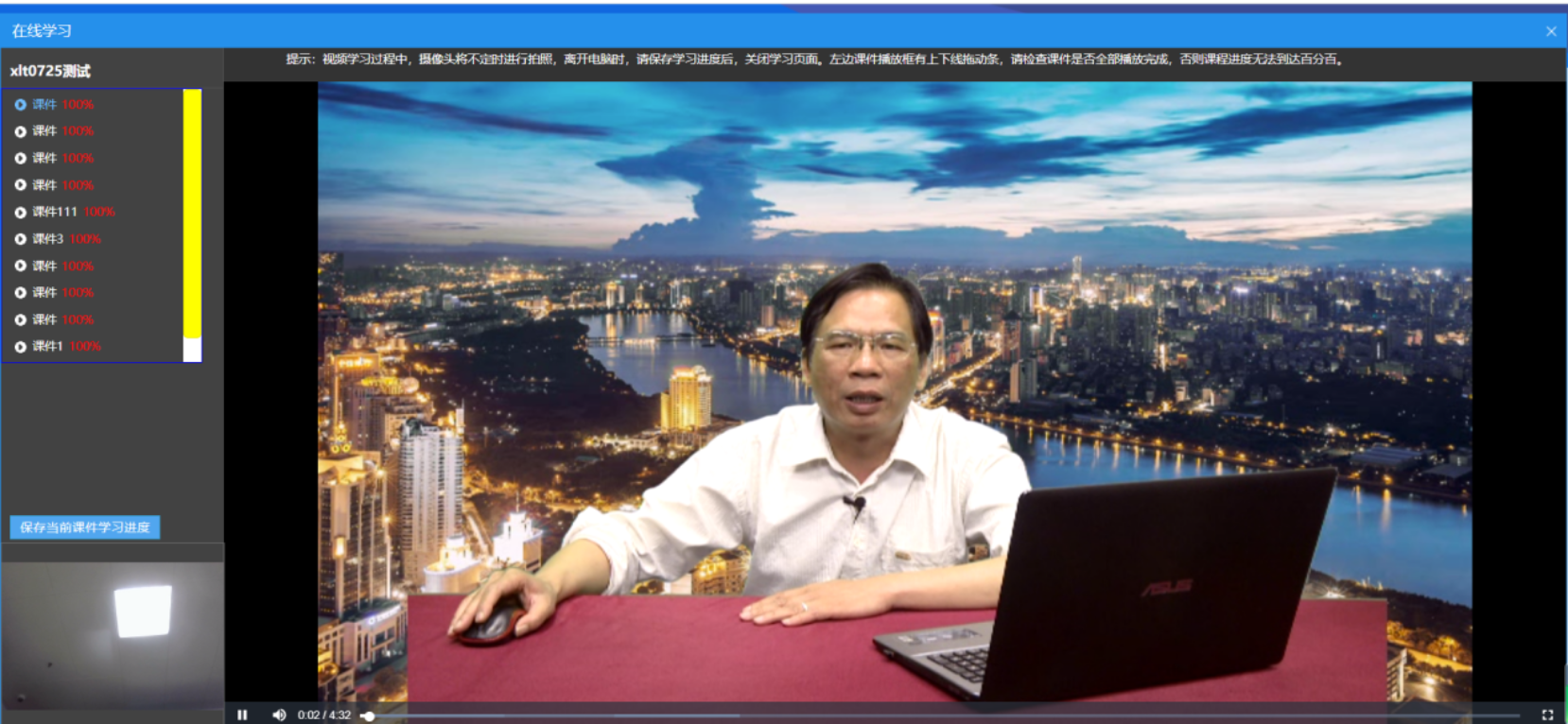 注意:继续教育或者能力测试系统会不定时抓拍相片,需看查左下角摄像头是否正常,请尽量将摄像头角度对准正脸。