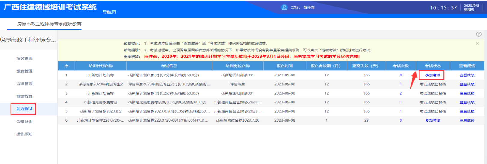 完成继续教育后,进入“能力测试”模块,点击参加“能力测试”后即可进入能力测试,根据浏览器选择对应的通道,能力测试时检测摄像头是否正常,并及时保存答案,答题后提交试卷(注意:能力测试前需要确认摄像头硬件是否正常使用,能力测试过程系统会不定时进行抓拍,请尽量将摄像头角度对准正脸)。