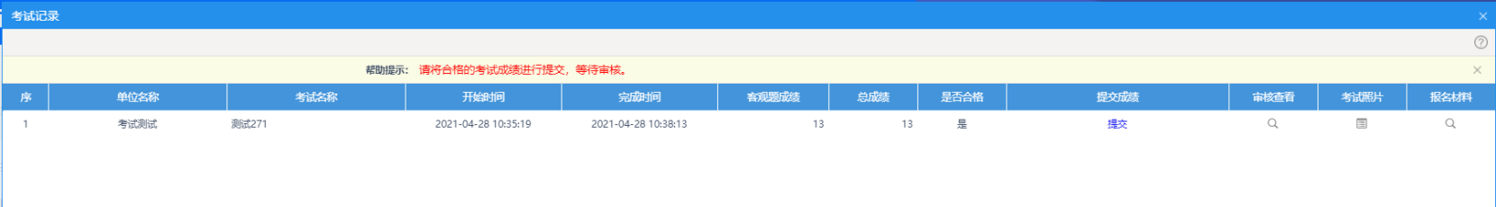 进入“能力测试记录”界面,可查看能力测试成绩是否合格,如果成绩不合格,点击对应能力测试计划“补测”按钮进行补测。如果补测一次仍不合格,则本次能力测试不通过。若成绩合格,点击“提交”等待主管部门审核能力测试记录。如果审核不通过,可点击“审核查看”按钮查看不通过原因。