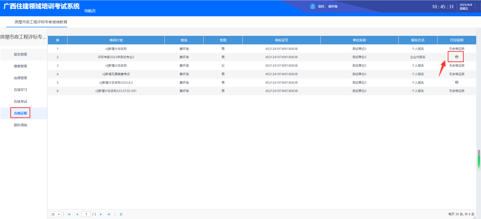 能力测试成绩审核通过后,即可在“合格证明”模块查看、打印合格证明。