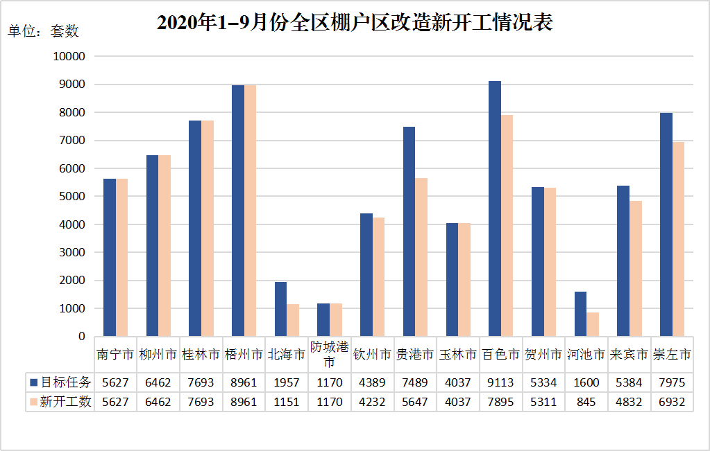 (一)全区棚户区改造新开工目标任务完成情况。2020年,国家下达我区棚户区改造目标任务为新开工6.985万套。截至9月底,全区已开工6.48万套,完成年度开工任务的92.79%。其中,南宁、柳州、桂林、防城港和玉林市已全部开工;崇左(86.92%)、百色(86.63%)、贵港(75.40%)和河池市(52.81%)开工率相对滞后,梧州市开工实物量有待提升,有部分市县还存在项目未开工,补助资金、债券资金闲置、截留的情况,具体项目包括:贵港市堤路园棚户区改造项目(二期)棉村B标安置区(1842套),崇左市城区棚户区改造项目城南安置小区二期(1043套),百色市大旺片区城中村改造项目(718套)、城中片区棚户区改造项目(500套),河池市汽车电机厂棚户区(危旧房)改造(200套)、广西轴承厂棚户区(危旧房)改造(550套),钦州市沙坪城中村农民安置小区(109套)、浦北县木材加工厂(危旧房)棚户区改造项目(48套),贺州市生态产业园棚户区改造项目(23套),河池市罗城仫佬族自治县二轻联社四厂区(5套)。