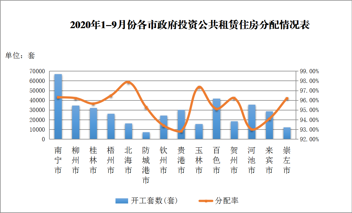 (二)全区公共租赁住房新增实物保障和基本建成目标完成情况。2020年,全区公共租赁住房新增实物保障任务为9553套,截至目前,已完成11035套,完成比率为115.51%。其中,完成比率达90%以上的有柳州、梧州、防城港、钦州、贵港、百色和贺州市;完成比率低于70%的有玉林(51.92%)、北海(27.59%)和南宁市(15.20%)。