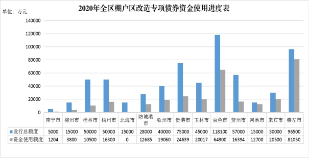 2020年8月,全区发行棚户区改造专项债券共计63.96亿元,用于支持在建、续建棚户区改造建设12万套。截至9月底,全区已使用棚户区改造专项债券30.38亿元。除河池(84.67%)、崇左(83.99%)、来宾(68.33%)、百色(54.95%)和钦州市(47.65%)等5个城市外,其余城市的使用率尚不足全区使用率平均水平。2020年棚户区改造专项债支持的71个项目中,有58个项目的资金已全部拨付至项目业主,有6市8县的资金已100%支出使用。部分城市存在专项债券资金未使用或使用进度较慢的情况,债券资金滞留在财政部门或项目业主、支出率为0的项目有15个,分别为桂林(1个)、梧州(3个)、北海(3个)、防城港(1个)、玉林(2个)、百色(3个)、贺州(1个)和崇左市(1个);债券资金使用率低于1.5%的项目有3个,分别为贵港市棚户区改造(三期)白凹窝安置区项目(1.33%)、玉林市玉林龙潭产业园南区棚户区改造项目(0.17%)和贺州市粤桂县域经济产业合作示范区(城中村)棚户区改造项目(信都、铺门片区)(0.18%)。