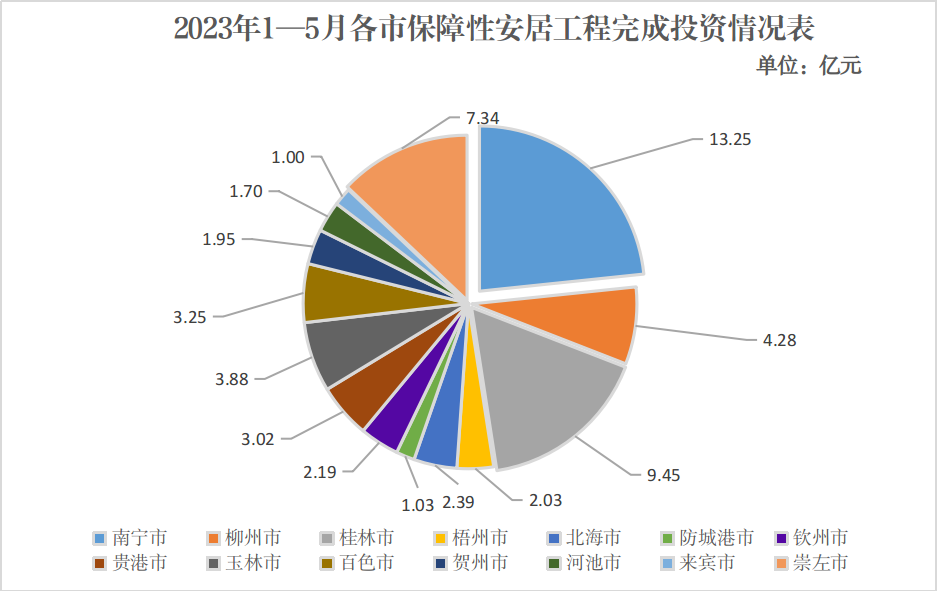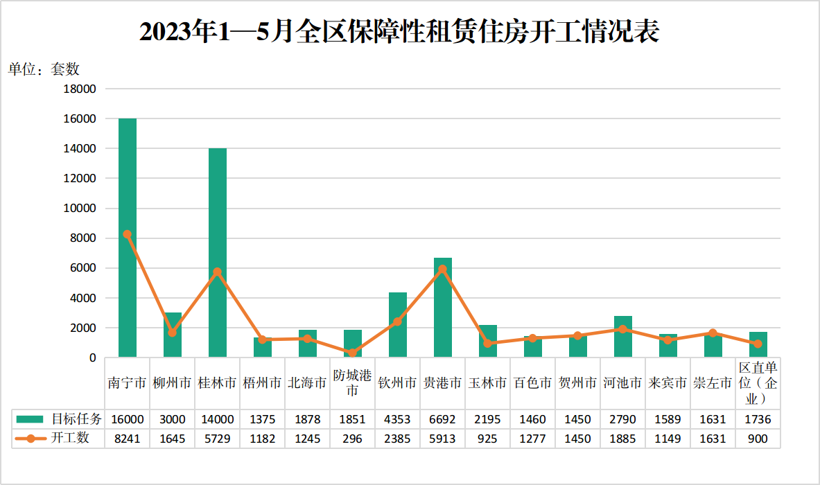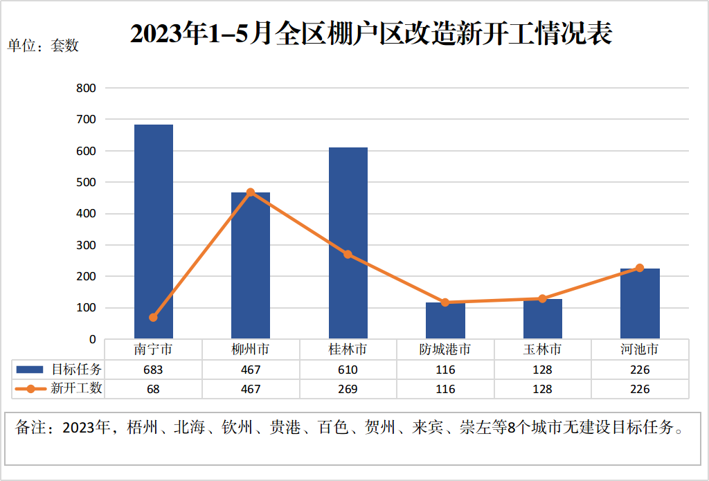 ⒈全区棚户区改造新开工目标任务完成情况。2023年,全区棚户区改造新开工目标任务为2230套。截至5月25日,已开工1274套,完成年度目标任务的57.13%。其中,柳州、防城港、玉林、河池市等设区市均已全部实现开工,桂林市开工率为44.1%,南宁市开工率为9.96%。
