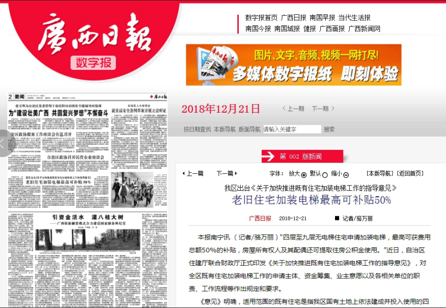 图3:2018年12月,我厅会同自治区财政厅印发了《加快推进既有住宅加装电梯工作的指导意见》,《广西日报》等多家媒体对此进行了详细的解读。